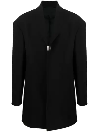 black cotton-wool blend notched lapels oversized shoulders long sleeves mid-length