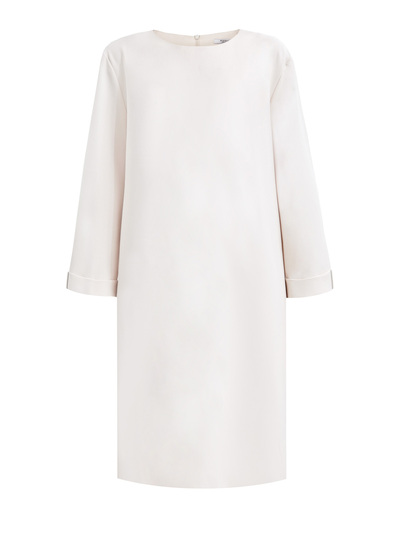 Элегантное платье-миди от Peserico создано из гладкого крепа в оттенке слоновой кости. Рукава ¾ с мерцающим ювелирным декором Punto Luce придают изделию изысканный акцент. Детали: прямой крой, застежка на потайную молнию на спинке, прорезные карманы.