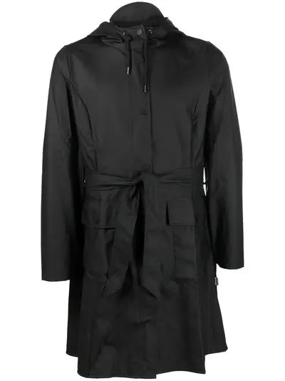 jet black drawstring hood belted waist front press-stud fastening long sleeves A-line two side flap pockets waterproof windproof When buying this unisex item, keep in mind that it is graded in standard men's sizing.
