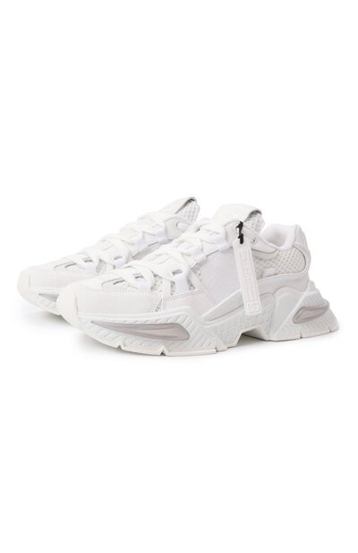 Для изготовления белых кроссовок Air Master использовали комбинацию легкой сетки, гладкой матовой кожи и прочной замши, а внутреннюю отделку выполнили из мягкого фактурного текстиля, который быстро впитывает и отводит влагу. Язычок и задник декорировали крупной DG-монограммой из первых букв фамилий Доменико Дольче и Стефано Габбаны. Полупрозрачные глянцевые вставки делают широкую подошву визуально легкой.