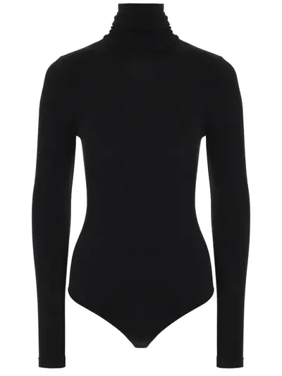 -Базовое черное боди с бесшовной технологией производства от WOLFORD. -Облегающий крой, длинные рукава, высокий ворот с отворотом, который закрывает шею, мягкий хлопок к телу и шелковистый блеск снаружи.