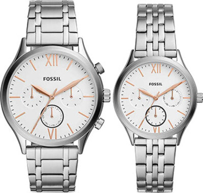 Мужские и женские кварцевые часы. Центральные часовая, минутная и секундная стрелки. Отображение даты и дня недели в малых циферблатах. 12/24х часовой формат времени. Белый циферблат. Круглый корпус выполнен из нержавеющей стали. Диаметр корпуса мужских часов составляет 44 мм. Диаметр корпуса женских часов составляет 36 мм. Стальной браслет шириной 22 и 18 мм соответственно, раскладывающаяся застежка. Прочное минеральное стекло устойчивое к мелким механическим повреждениям. Водостойкость WR 50 (мытье рук, дождь).