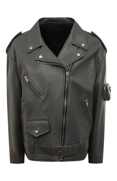 Более свободный силуэт и спущенная линия плеч добавили серой косухе расслабленности. Увеличенным пропорциям вторит крупный карман на левом рукаве, стилизованный под фирменную треугольную эмблему. Слегка изменился не только крой, но и материал. На нежной наппе вытиснили неровный рисунок, имитирующий естественные заломы, а затем отполировали кожу до глянцевого блеска.