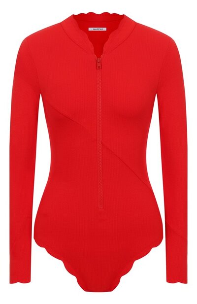 Слитный купальник выполнили из эластичной микрофибры с узором Basketweave. Модель с фестонами на вороте, длинных рукавах и проймах застегивается укороченной молнией.