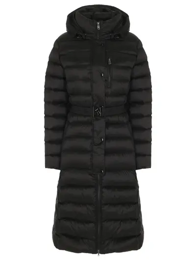 -Прямой крой, приталенный поясом с пряжкой в форме логотипа, длинные рукава, прорезные карманы на молниях, воротник-стойка, капюшон на кулиске, застежка на молнию с двумя пуллерами за ветрозащитной планкой на кнопках, благодаря которой можно комфортно ездить в автомобиле, расстегнув нижнюю часть и не снимая пуховик целиком.