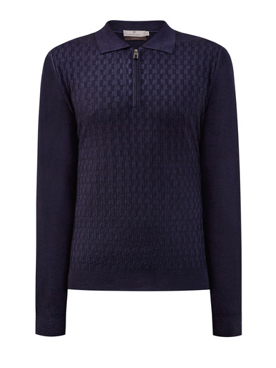 Мужской джемпер-поло в стиле casual от Canali выполнен из шерсти и шелка в оттенке ночного неба. Благодаря свойствам натуральных волокон материал поддерживает температуру тела на комфортном уровне. Фактурный узор на передней планке позволяет создать нескучный повседневный образ. Детали: традиционный отложной воротник, эластичная отделка кромок, застежка на молнию. Сделано в Италии.