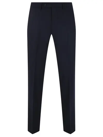 -Темно-синие классические брюки из мягкой смесовой шерсти от BERWICH. -Средняя посадка, пояс со шлевками, прорезные карманы, застежка на молнию и пуговицу, графичные стрелки.