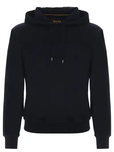 -Синее худи из мягкой шерсти от MOORER. -Полуприлегающий силуэт, длинные рукава, рельефные манжеты и пояс, капюшон на кулиске, крупный вышитый логотип на груди.