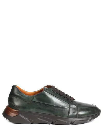 -Зеленые кроссовки из кожи с окрасом в технике деграде от BONTONI. -Округлый мыс, толстая резиновая подошва, функциональная шнуровка, логотип на пятке, внутренняя отделка из шерстяной байки.