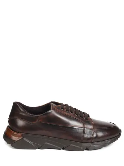 -Коричневые кроссовки из кожи с окрасом в технике деграде от BONTONI. -Округлый мыс, толстая резиновая подошва, функциональная шнуровка, логотип на пятке, внутренняя отделка из шерстяной байки.