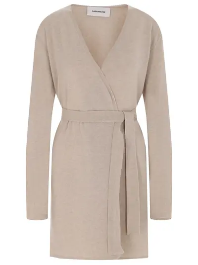 -Бежевый кардиган из смесовой шерсти с добавлением кашемира от SASHAVERSE. -Модель со свободным запахом пол, которые фиксируются поясом на талии, спущенной линией плеча, длинными рукавами и V-образным запахом на груди.