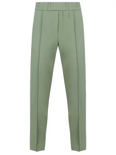 -Зеленые зауженные брюки из смесовой вискозы от LE TRICOT PERUGIA. -Крой по фигуре, средняя посадка, эластичный пояс, прорезные карманы, графичные стрелки, которые визуально вытягивают силуэт.