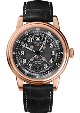 Механические часы с автоподзаводом. Водостойкость WR 100. Центральные часовая, минутная и секундная стрелки. Индикация даты и дня недели. Система противоударной защиты Incabloc. Стрелки и метки с люминесцентным покрытием. Черный циферблат с часовыми индексами в виде цифр. Корпус выполнен из нержавеющей стали с PVD покрытием. Диаметр корпуса 41 мм. Устойчивое к возникновению мелких механических повреждений сапфировое стекло. Прозрачная задняя крышка. Кожаный ремешок черного цвета.