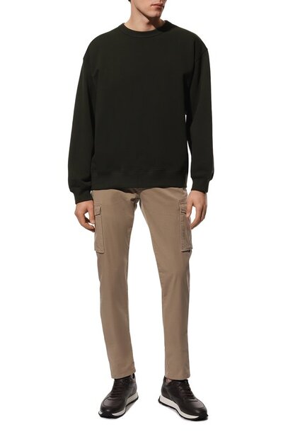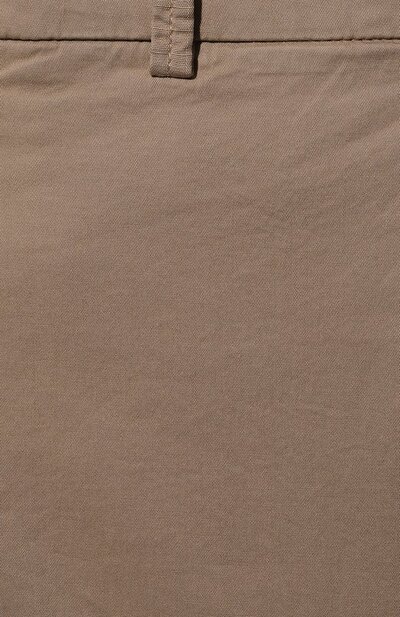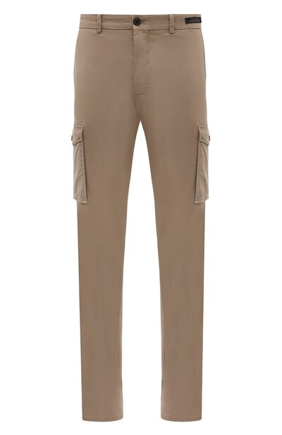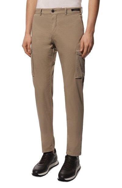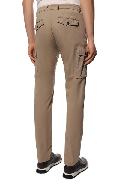 Для пошива бежевых карго команда марки использовала мягкую хлопковую ткань. Этот материал хорошо пропускает воздух, а эластан в его составе помогает модели подстраиваться под движения тела и не сковывать их. Брюки с крупными накладными карманами по бокам дополнили съемным брелоком в виде акулы.