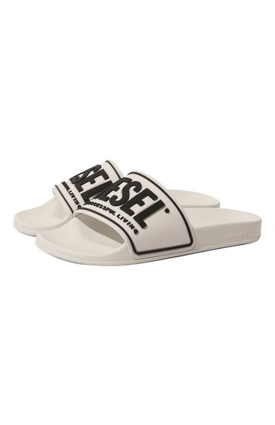 Белоснежные шлепанцы декорировали на союзке рельефным контрастным логотипом, указав на принадлежность обуви бренду. Для изготовления модели использовали прочный полиуретан, который легко очищается от загрязнений. Широкая подошва поможет меньше скользить на мокром покрытии у бассейна.