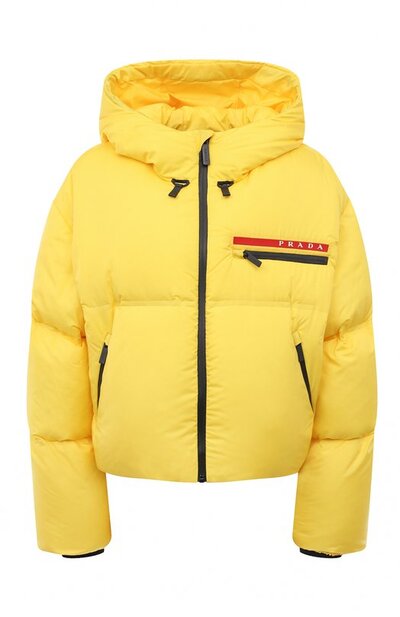 Укороченная желтая куртка с невесомым синтетическим наполнителем дополнена регулируемым капюшоном и карманами с прорезиненными молниями. Миучча Прада выбрала для изготовления стеганой модели непромокаемую и непродуваемую ткань Daiichi Orimono с матовой шелковистой поверхностью. На принадлежность линии Linea Rossa указывает красная брендированная нашивка.