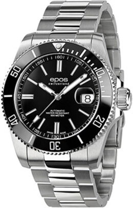 Мужские механические часы с автоподзаводом. Центральные часовая, минутная и секундная стрелки. Апертура даты с увеличительным стеклом в позиции 3 часов. Черный циферблат. Круглый корпус выполнен из нержавеющей стали и керамического безеля. Диаметр корпуса составляет 41,5 мм, толщина 13,3 мм. Заводная головка с защитой. Стальной браслет шириной 22 мм, раскладывающаяся застежка. Устойчивое к возникновению царапин сапфировое стекло. Водостойкость WR 500 (погружение с аквалангом).