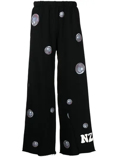 black/multicolour cotton wide leg all-over graphic print slogan print to the rear logo print at the leg raw-cut hem wide leg high-waisted elasticated waistband slip pockets to the sides When buying this unisex item, keep in mind that it is graded in standard men's sizing.