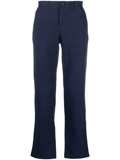 navy blue linen/flax front button and zip fastening two diagonal pockets to the sides two rear welt pockets belt loops folded edge