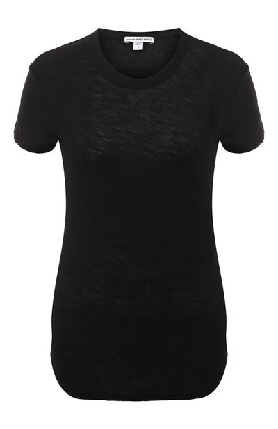 Черную футболку с короткими рукавами сшили из тонкого слаб-трикотажа, связанного из нежного премиального хлопка. Материал с характерной неоднородной фактурой хорошо пропускает воздух и легко тянется, гарантируя комфорт в течение всего дня. Окрашивание с добавлением смягчающих энзимов сделало изделие еще приятнее на ощупь.