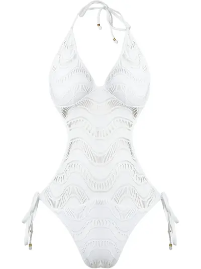 White cut out pattern swimsuit from Amir Slama featuring a v-neck, underwired cups, cut out details, a back tie fastening and an open back. This item is true to fit. Please note this item has a brazilian cut.