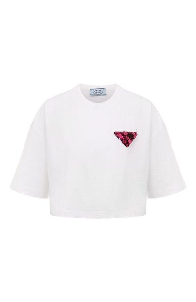 Укороченная длина, открывающая талию, делает белую футболку женственнее, а знаковый треугольник, вышитый ярко-розовыми глянцевыми пайетками, — наряднее. Миучча Прада и Раф Симонс выбрали для пошива модели мягкое джерси из премиального хлопка. Дышащий материал слегка тянется, гарантируя свободу движений.