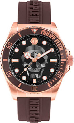 Мужские кварцевые часы. Центральные часовая, минутная и секундная стрелки. Коричневый циферблат с фирменным изображением черепа. Круглый корпус выполнен из нержавеющей стали с IP покрытием цвета розового золота. Диаметр корпуса составляет 44 мм, толщина 11,5 мм. Заводная головка с защитой. Коричневый каучуковый ремешок шириной 22 мм, стандартная застежка. Прочное минеральное стекло устойчивое к мелким механическим повреждениям. Водостойкость WR 100 (плавание без погружения).