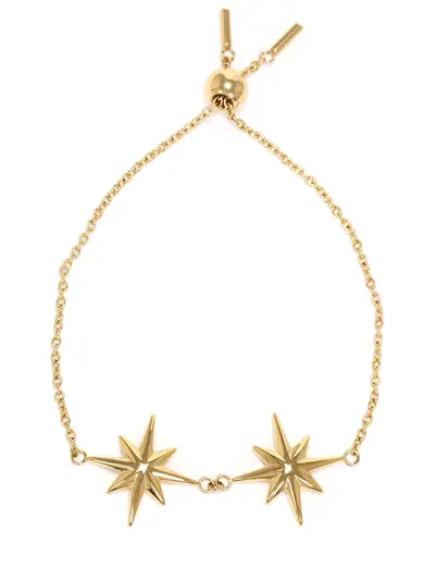 -Золотистый браслет со звездами от EXCLAIM. -Модель выполнена из бижутерного сплава в виде цепочки с мелкими звеньями и двумя восьмиконечными звездами, объем регулируется шариком.