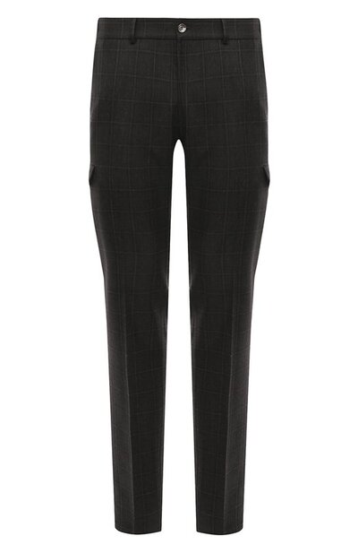 Темно-коричневые клетчатые брюки раскроены по лекалам костюмных вариантов. Модель сделали практичнее накладными карманами, как у карго, а затем эластичной вставкой на поясе сформировали комфортную посадку на талии. Для пошива изделия выбрали тонкую шерсть, которая почти не мнется и поддерживает оптимальную температуру.