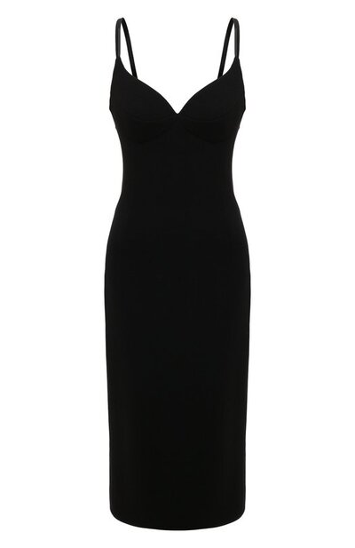 Черное платье в исполнении Игоря Чапурина получилось сдержанным и вместе с тем элегантным. Приталенную модель со структурированным лифом и фигурным декольте в форме сердца сшили из нежной шелковистой вискозы, которая слегка мерцает в лучах света. Изделие с узкими бретелями, оставляющими обнаженными плечи и спину, застегивается потайной молнией сзади.
