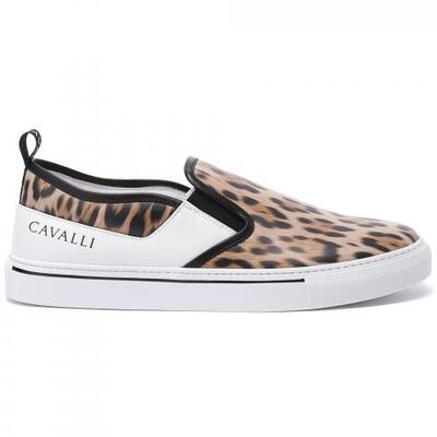 Слипоны из кожи с леопардовым принтом от Roberto Cavalli. Эффектная модель из натуральной кожи на практичной резиновой подошве белого цвета. Сбоку фирменный логотип дома Cavalli. Материал подкладки и стельки - натуральная кожа.