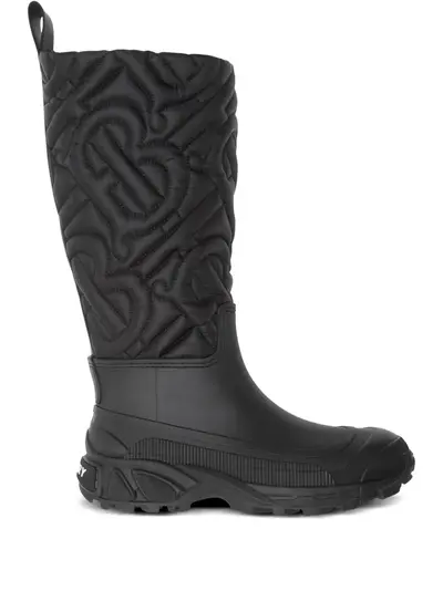 black leather trim quilted signature TB monogram pattern wool blend lining round toe knee-length pull-tab at the heel chunky rubber sole