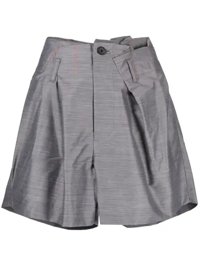 asymmetric-design relaxed shorts medium grey asymmetric design contrast stitching pleat detailing belt loops high-waisted front button fastening two rear welt pockets thigh-length