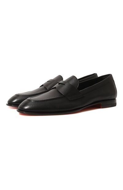 Для изготовления пенни-лоферов универсального черного цвета Джузеппе Сантони выбрал мягкую, но прочную кожу. Со временем такая обувь без внутренней отделки станет еще удобнее: материал тонкой ручной выделки немного тянется, комфортно повторяя изгибы стопы. Четко выверенный силуэт пары с миндалевидным мысом мастера бренда подчеркнули полировкой до полуглянцевого блеска.