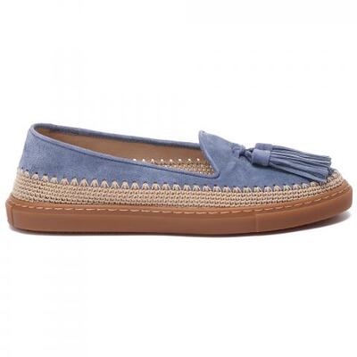 Эспадрильи из мягкой голубой замши от Fratelli Rossetti. Очень мягкие и удобные, эти туфли подойдут к образам в стиле casual на каждый день. Замшу верха удачно дополняет плетёная вставка у подошвы и фирменные замшевые кисточки сверху. Гибкая подошва выполнена из резины, стелька - из натуральной кожи.