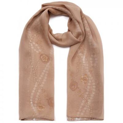 Шарф в бежевом цвете от Pollini. Этот воздушный шарф выполнен из 100% шелка в оттенках бежевого, благодаря чему он прекрасно впишется в любой образ. Шарф украшает фирменный принт виде цепочек и цветов. Длина шарфа - 180 см, ширина - 70 см.
