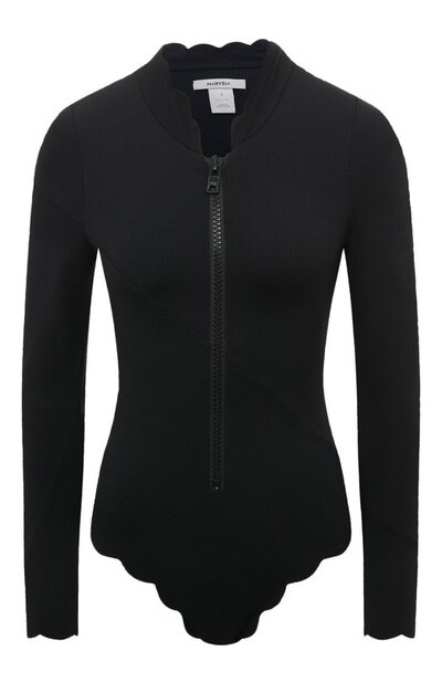 Черный слитный купальник, напоминающий кардиган, максимально комфортно облегает фигуру. Такое свойство модели придает фирменный эластичный материал на основе прочного шелковистого нейлона. Края изделия, застегивающегося длинной молнией спереди, акцентировали крупными фестонами, обработанными лазером.