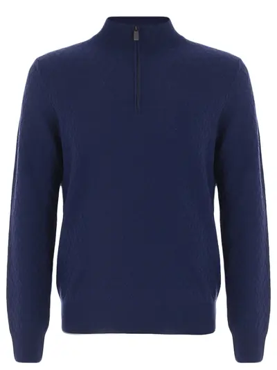 -Джемпер из мягкого шерстяного трикотажа с фактурным мотивом от CANALI. -Полуприлегающий силуэт, длинные рукава, эластичные манжеты и пояс, воротник-стойка для большего удобства дополнили короткой молнией.