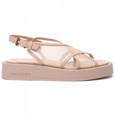 Бежевые сандалии из кожи наппа и сетки от Baldinini. Эти сандалии с ремешком на пятке, украшенные перекрещивающимися сетчатыми деталями, привнесут изюминку в ваш повседневный образ. Резиновая подошва на платформе высотой 2,5 см придаёт дизайну массивности, а фирменная пряжка - немного блеска. У пары удобная стелька из натуральной кожи.