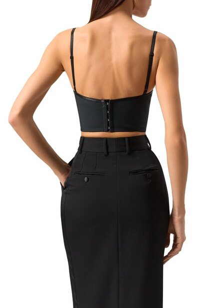 Для пошива черного кроп-топа Доменико Дольче и Стефано Габбана выбрали тонкий атлас. Гладкий плотный материал с добавлением эластана слегка тянется, а изделие из него комфортно облегает фигуру. Линию декольте подчеркнули узкими лентами, которые соединяются с регулируемыми бретелями.