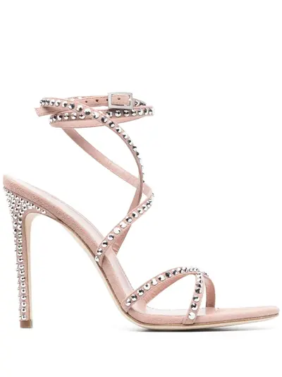 rose pink calf leather rhinestone embellishment thin straps lace-up detailing buckle-fastening ankle strap open toe branded insole high stiletto heel