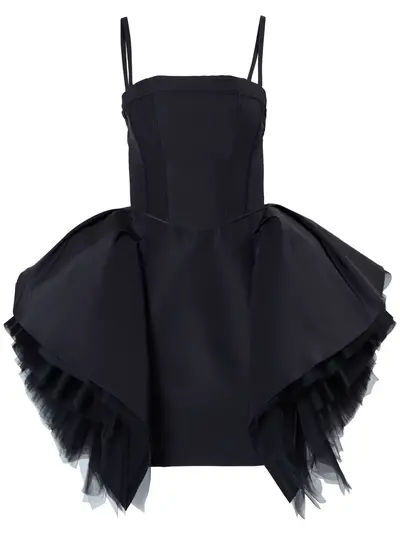 black silk ruffled detailing tulle inserts corset style square neck spaghetti straps rear zip fastening thigh-length