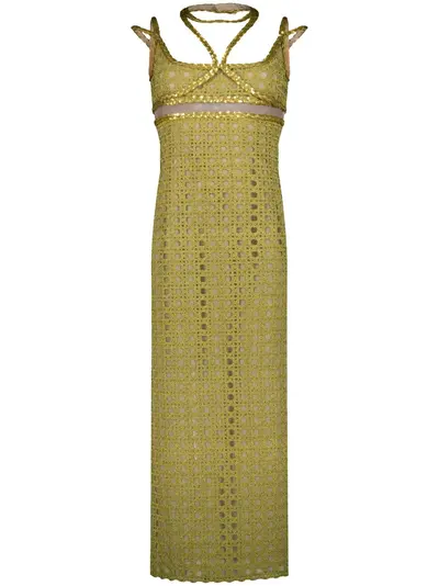 olive green braided edge macramé detailing cut-out detailing halterneck sleeveless straight hem ankle-length