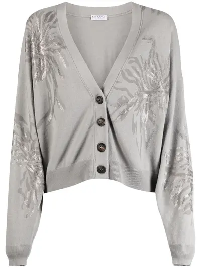 light grey virgin wool blend glitter detailing V-neck front button fastening drop shoulder long sleeves ribbed cuffs and hem