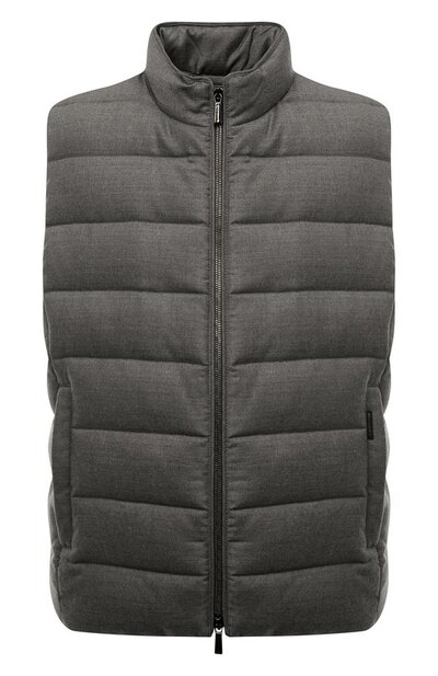 Серый меланжевый жилет – комфортный вариант для переменчивой погоды. Для пошива модели с воротником-стойкой и боковыми карманами использовали непродуваемую шерстяную фланель с добавлением нежного кашемира. Отборный пух, равномерно распределенный по узким стеганым камерам, отлично удерживает тепло и делает вещь легкой.