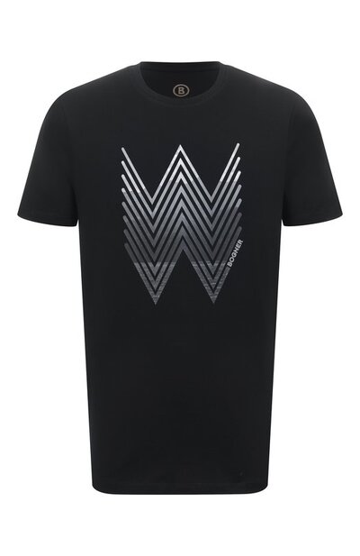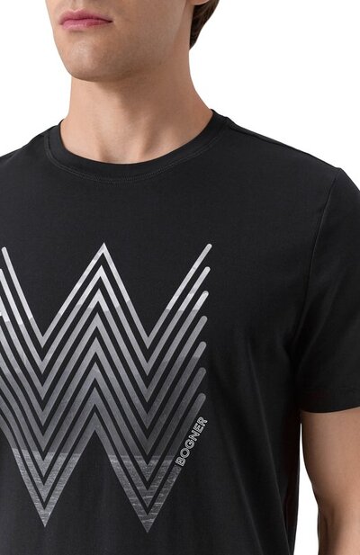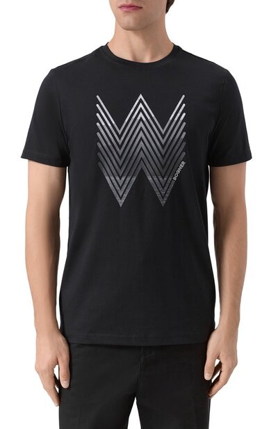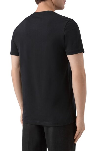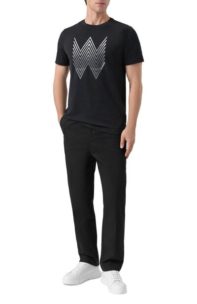 Черная футболка с короткими рукавами и круглым вырезом украшена спереди говорящей надписью. Легкая модель прямого кроя выполнена из гладкого хлопкового джерси, которое отлично пропускает воздух и не ограничивает свободу движений. Предлагаем создать образ с желтыми брюками и белыми кедами.