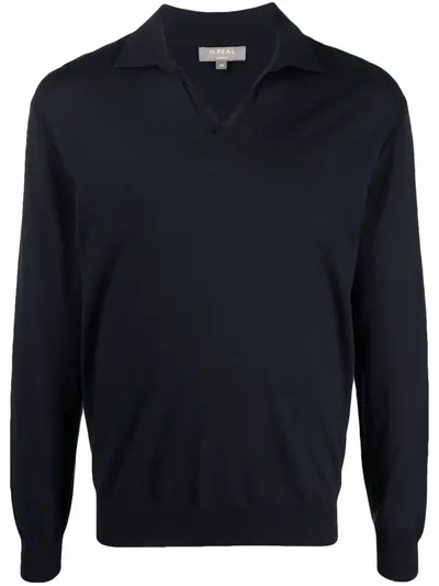 navy blue cotton-cashmere blend fine knit ribbed detailing polo collar long sleeves straight hem