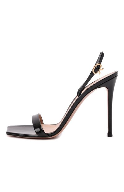 Несмотря на черный цвет босоножки Stiletto из осенне-зимней коллекции 2021 года практически незаметны: на ноге их удерживают узкая перемычка и регулируемый ремешок с золотистой фирменной пряжкой. Джанвито Росси выбрал для пошива пары гладкую лаковую кожу ручной выделки. Таким же материалом обтянули высокий тонкий каблук, который и дал название модели.