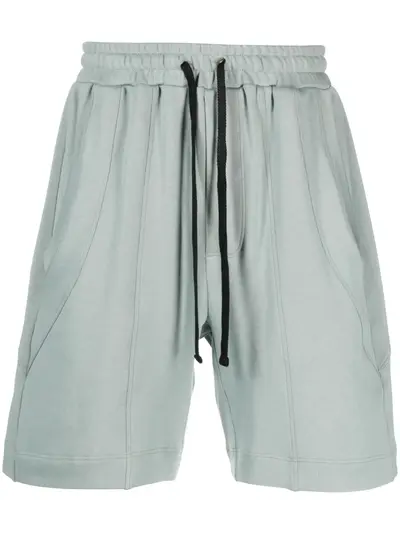 blue-grey organic cotton elasticated drawstring waistband two diagonal pockets to the sides rear welt pocket above-knee length
