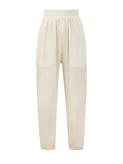 Элегантные брюки свободного укороченного кроя от Gentryportofino выполнены в кремовом оттенке. Модель из тонкого струящегося шелка идеально подходит для создания повседневных и вечерних образов. Широкий эластичный пояс и манжеты в резинку обеспечивает комфортную посадку по фигуре, прорезные карманы завершают минималистичный дизайн. Сделано в Италии.